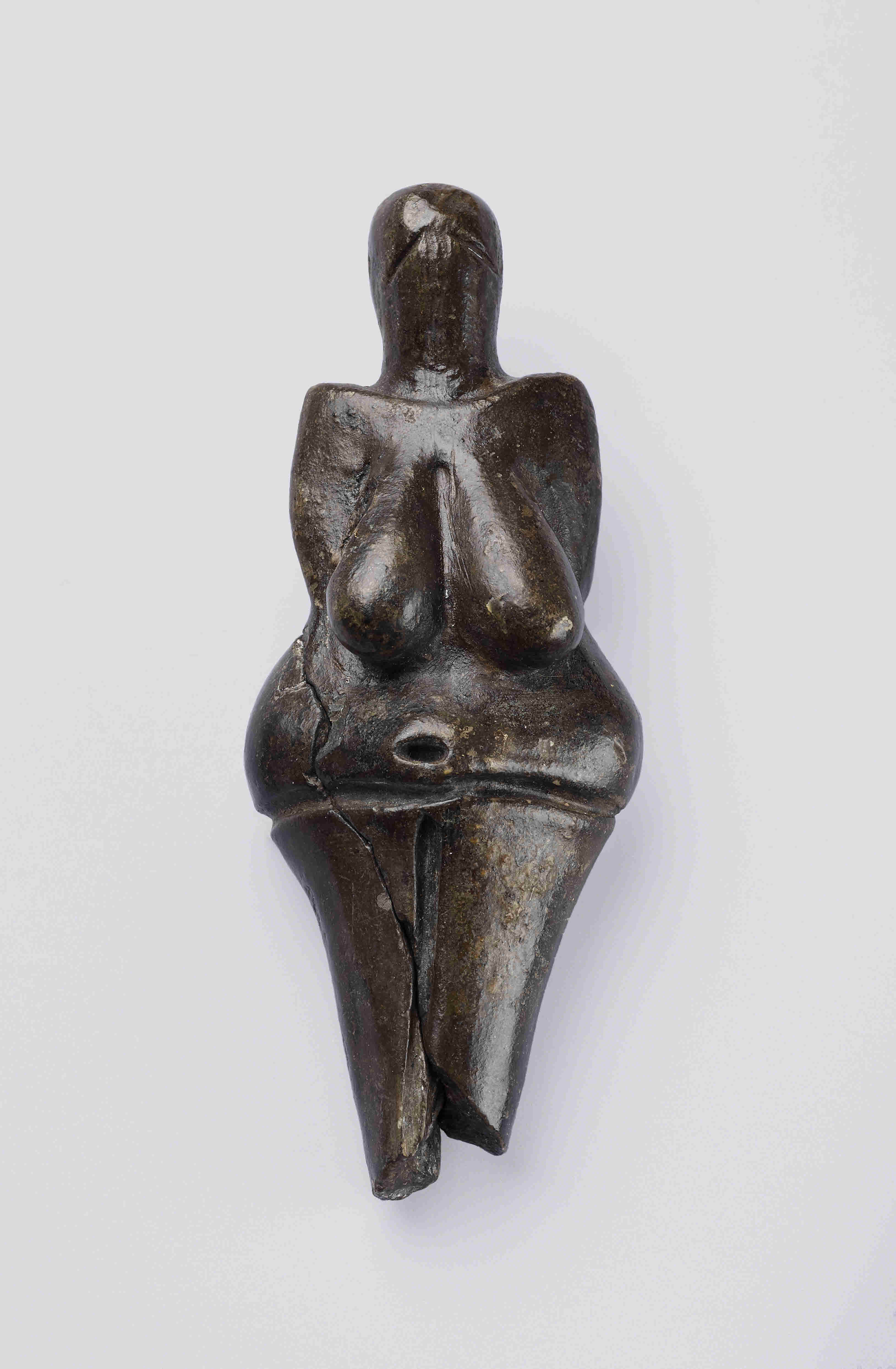 When the figurine was found by archaeologists, it was broken into two pieces. You can still see the break if you look carefully.